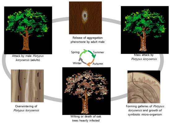 The disease cycle of KOW is closely related to the life cycle of P. koryoensis. Male beetles make entry holes in oak trees in May and beetle frass is found in the trunk and soil around the trunk []. Heavily attacked oak trees die due to systematic wilting in late July to early September (Figure 4). The leaves of dead trees remain on the tree after autumn because oak trees die without the formation of an abscission layer [] (Figure 3).