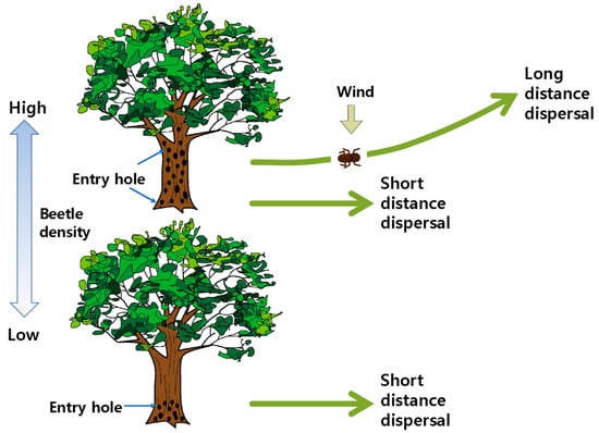 The beetle’s flight distance was estimated using mark–release–recapture methods, marking beetles with fluorescent powders and recovering marked beetles with sticky traps deployed in the oak forest studied []. At least 300 individuals were released in each trial at 11:00 a.m. in late June 2013 when beetle flight propensity was greatest, and recaptured individuals were counted after three hours. No marked beetle was recaptured the next day []. Recapture efficiency was 6.0 ± 1.6% and the mean dispersal distance was 18.0 ± 1.3 m. The annual movement distance in infested stands in Jinan, Jeollabuk-do was 24.1 m and 19.9 m from 2012 to 2013 and from 2013 to 2014, respectively, showing that the beetle’s limited dispersal distance reasonably explained the slow movement of infested stands. A mechanism of long-distance dispersal was proposed to explain movement of beetles over several kilometers. The proposed mechanism postulates that when the beetle density in a tree becomes high, the beetle forms entrance holes in the upper trunk rather than the lower trunk as usual, to reduce intensive intra-specific competition []. The beetles emerging from galleries in the upper trunk probably have the potential to fly longer distances, possibly aided by wind (Figure 5). Satellite image analysis showed that KOW hot spots had jumped about 12.5 km per year [].