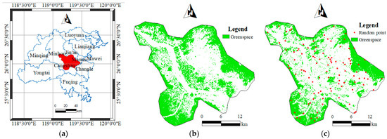 Location of Fuzhou City and spatial distribution of greenspace: (a) study area; (b,c) spatial distribution of greenspace in 2000 and 2016, respectively.