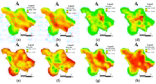 Spatial distribution of landscape metrics using a window size of 3 km: (a,b) calculated NDVI for each cell (30 m spatial resolution) within a 3 km neighborhood using the focal statistics tool in ArcGIS software in 2000 and 2016; (c,d) calculated AI in 2000 and 2016; (e,f) calculated PD in 2000 and 2016; (g,h) calculated PLAND in 2000 and 2016.