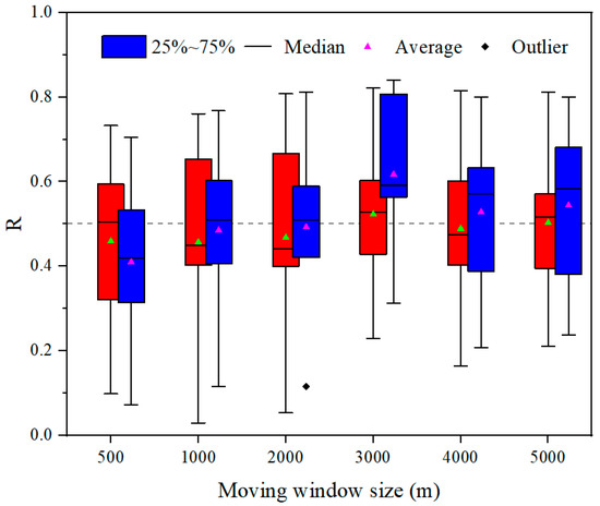 Box plot of correlation coefficients between VQI indicators for different moving window sizes. The red box indicates the year 2000, while the blue box indicates the year 2016.