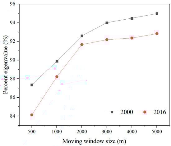 Table 3 shows the PCA results of VQI, indicating that the percentage eigenvalues of PC1 were 84.134–94.993% for all window sizes in both of the studied years. Figure 4 reveals that the percentage eigenvalues increased as the window size increased, with the curves growing quickly up to a window size of 3 km before becoming relatively stable in both of the studied years. The percentage eigenvalues of PC1 were 94.014% and 92.192% for a window size of 3 km in 2000 and 2016, respectively, indicating that this component could express more than 92% of the information of all the factors. The correlations among all VQI indicators were also highest for a window size of 3 km; thus, PC1 with a 3 km window size was chosen to construct the VQI.