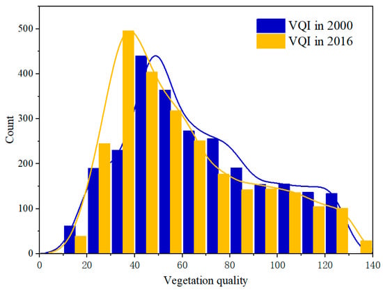 Histogram and kernel smooth curves of the vegetation ecological quality in 2000 and 2016.