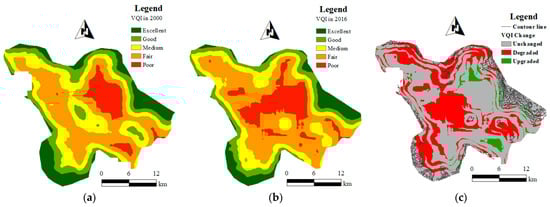 Spatial distribution in the VQI and its changes in 2000 and 2016: (a) 2000; (b) 2016; (c) change in VQI between 2000 and 2016.