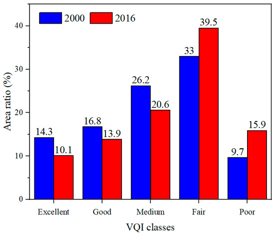 The area ratio of each VQI class in 2000 and 2016.