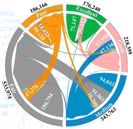 Figure 6a,b indicate an obvious circle structure in the spatial distribution of the VQI in both study years, with the values gradually increasing from the center to the periphery. Meanwhile, we can also see that the fair and poor levels of the VQI areas showed a larger expansion trend within the city from 2000 to 2016. Figure 6c reveals the temporal variation of the VQI between 2000 and 2016. Our calculations revealed that the unchanging area still represented the majority, accounting for 65.5% of the study area; a considerable proportion of the study area was degraded, accounting for 31.4%, while only a small proportion of the study area was improved, accounting for 3.1%. As shown in Figure 8, most of the transitions (93.0%) of the VQI classes occurred between adjacent levels, and only a small number of transitions (7.0%) occurred across multiple levels. The latter mainly occurred in the transformation from a good level of the VQI to fair and poor levels of the VQI, or from a medium level of the VQI to a poor level of the VQI.