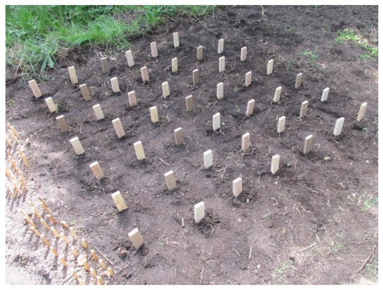 The stakes were buried in the outdoor exposure testing field at the University of Sopron (47°40′41.4″ N 16°34′32.6″ E) in April 2016 (Figure 1). The stakes were buried half of their length, one by one from each type. The distance between stakes was 30 cm. The vegetation on the field was cut regularly, and no chemicals or herbicides were used during the test. The presence of wood-decaying fungi and insects was also observed during the evaluation.