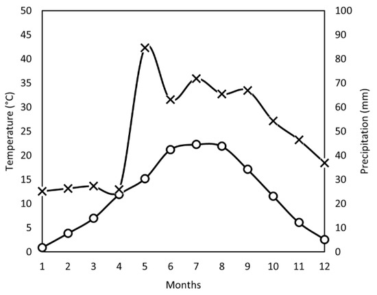 Tables S1 and S2 list the weather parameters of the study site. The area of the study site has a warm and wet summer season (May–September) with mean temperatures between 13–23 °C, with a maximum of 37 °C, and monthly average precipitation between 63–85 mm. It has a drier winter season (October–April) with 25–54 mm of average precipitation per month, mean temperatures between −4–16 °C, with a maximum of 28 °C. The average annual rainfall during the test period was approximately 594 mm; the average annual temperature was 12 °C; the maximum temperature was 37.2 °C. The relative humidity ranged from 45 to 91%.