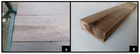 In this research, a field test, specifically an in-ground test was used, where the wood was partly in contact with the soil, and the impact of atmospheric and biological factors was direct. Non-destructive methods such as visual assessment, macroscopic evaluation, density and mass loss, sound (sonic tomography), optical methods (X-ray tomography), microscopy, radiography, or destructive methods such as the pick/splinter test or strength tests can all assess wood degradation [1,2].