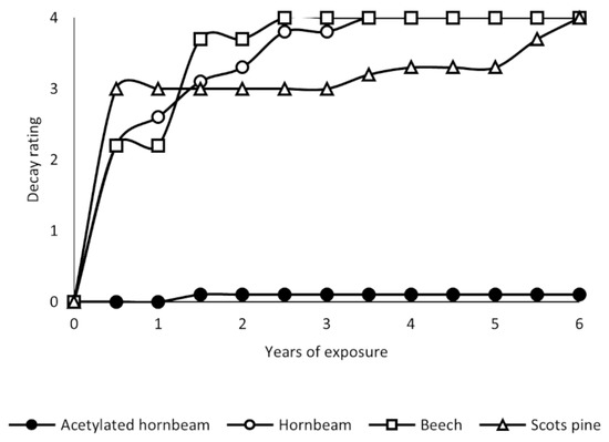 Figure 4 summarizes the rating and lifetime of each stake. The average lifetime of untreated hornbeam, beech and Scots pine was 2.0 ± 1.0, 1.8 ± 0.6, and 5.1 ± 1.0 years, respectively., and all of the stakes broke. Acetylated hornbeam stake number 7 had mild local brown rot decay, while the others showed no signs.