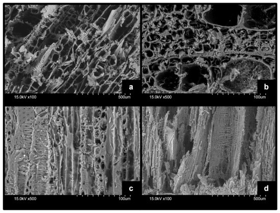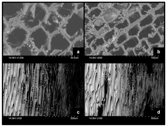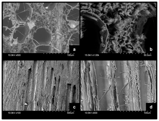 SEM pictures of cross section (above) and longitudinal section (below) of decayed beech wood: (a) fibrous tissue, (b) hyphae in lumen, (c) damaged bordered pits, (d) growing hyphae along vessels.