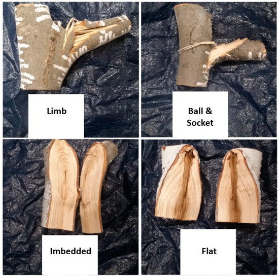 Failures were recorded as one of four types using a system adapted from Kane et al. [21]. The failure types included limb; ball and socket; imbedded; and flat (Figure 4). A limb is classified by the branch tissue failing immediately outside the connection zone leaving no visible stem damage. Ball and socket failures are characterized by excision of stem tissue during failure resulting in a concave shape on the stem’s surface. The branch side of the broken surface contains the excised tissue and has a characteristic “ball” shape. An imbedded failure has a slightly convex portion on the branch tissue and a slightly concave portion on the stem tissue, leaving more issue on the stem than a flat failure, while a flat failure is characterized by a cleavage straight down the branch union that leaves nearly equal tissue on the branch and stem. The broken surface’s shape is flat and broad and has no concave portion on the stem side.