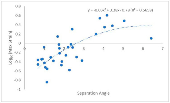 Polynomial best fit line between Log10(MaxStrain) and separation angle.