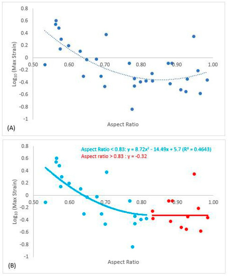 Polynomial best fit line between Log10(MaxStrain) and aspect ratio (A). Spline regression determined that the data plateaued when aspect ratio was greater than 0.83. The second graph (B) reports the regression equation for Log10(MaxStrain) and aspect ratio for lateral unions and the plateau value (−0.32) for Log10(MaxStrain) for codominant unions when aspect ratio was greater than 0.83.