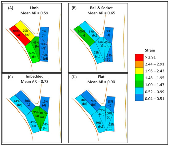 Mean max strain distribution and mean aspect ratio (AR) for each failure modes: limb (A), ball and socket (B), imbedded (C), and flat (D). Percentages indicate the percent of the mean maximum strain of all the zones for the given failure mode. ANOVA with HSD was conducted within each failure mode, and zones with different letters were found to be significantly different (see Table 3 for numerical analysis).
