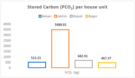 The calculation results of stored carbon (PCO2)—which was calculated based on Formula (1) of DIN EN 16449: 2014-06/EN 16449: 2014(D)—in housing measured in four cities/districts, are presented in Table 4 and Figure 1. Table 4 shows the total carbon stored in each house measured, and Figure 1 shows the average carbon stored in each housing unit. There is a striking difference between the carbon stored in the housing units in East Jakarta City and that stored in the other three cities/districts, due to the different types of houses: the type of house in East Jakarta is a two-story house with many doors and windows, and there are stairs with rails/railings and wooden handles. This is to show that in addition to the large volume (V) of wood components used, wood species of higher density (ρ) will also increase the amount of stored carbon.