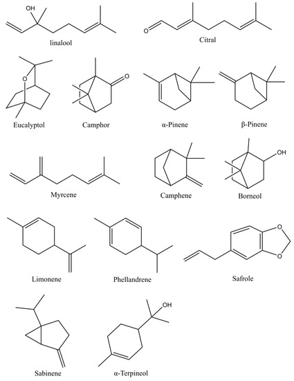 There are some distinctions in the chemical composition of CCEO due to differences in species of C. camphora, provenance, climate in the growing area, genetic factors, etc. At present, the essential oil chemical constituents of a total of 18 species of Cinnamomum have been identified, including C. camphora, C. camphora var. linaloolifera Fujita, C. longepaniculatum (Gamble) N. Chao ex H. W. Li, Cinnamomum parthenoxylon (Jack) Meisner, C. micranthum (Hay.) Hay, C. bodinieri Lévl. and C. chartophyllum H. W. Li, and about 330 kinds of compounds in CCEO have been identified [13].