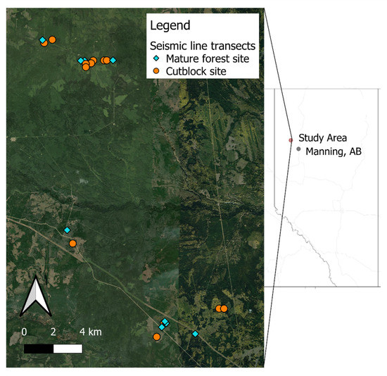 The study area was located approximately 70 km northwest of Manning, AB, Canada, and spanned 22 km between the furthest sites (Figure 1).