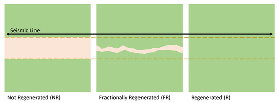 Schematic of each classification category on a seismic line: Not Recovered (NR), Fractionally Recovered (FR), and Recovered (R). Dashed line represents the estimated initial width from the 2000 imagery. Green = Forested/vegetated area. Beige = Not forested/vegetated.