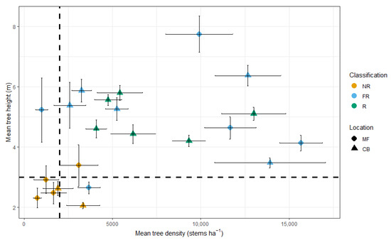 Mean tree height (m) and mean tree density (stems ha−1) of each seismic line transect (n = 22). Error bars represent one standard error of the mean. Colours indicate transect classification based on satellite imagery interpretation; Not Recovered (NR), Fractionally Recovered (FR), or Recovered (R). Symbols indicate the transect location: mature forest (MF) or cutblock (CB). The horizontal dashed line indicates the recovery criterion of 3 m tree height, and the vertical dashed line indicates the recovery criterion of 2000 stems ha−1.