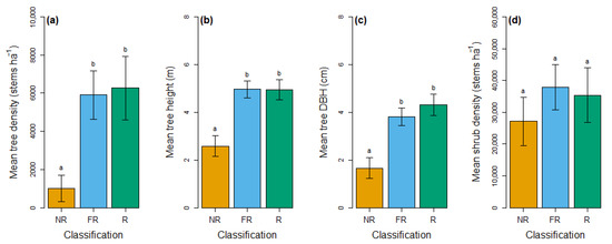 Mean tree density (trees > 1.5 m) (a), height (trees > 1.5 m) (b), DBH (trees > 1.5 m) (c), and shrub density (d), per classification category: NR (Not Recovered) (n = 6), FR (Fractionally Recovered) (n = 10), and R (Recovered) (n = 6). Error bars represent one standard error of the mean and differing letters between means indicate a significant difference (p < 0.05).