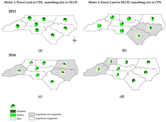 | Metric 3: Forest CDL, Other NLCD 2011 | Metric 4: Forest NLCD, Other CDL 2011 | Metric 3: Forest CDL, Other NLCD 2016 | Metric 4: Forest NLCD, Other CDL 2016 | ||