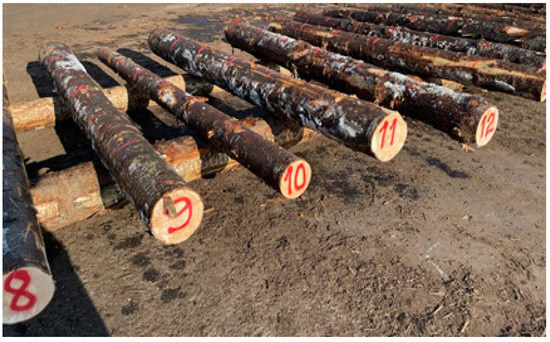 Data used in this study were collected in the sawmilling facility of the HS Timber Productions Reci S.R.L., which is located near the village of Reci, Covasna, Romania at the coordinates of 45°51′01″ N–25°56′52″ E. The company processes coniferous logs, mostly of Norway spruce (Picea abies, L. (Karst)), which is one of the dominant coniferous species in Romania [27]. Typically, the logs are delivered at the factory gate in lengths of 3 to 4 m. In the period used to collect the data, the sky was mostly clear and the weather was relatively cold.