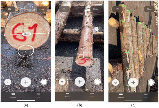 Examples of diameter and length measurements by the Measure app of iPhone in the first experiment (E1): (a) an example of using the Measure app and AR for diameter measurement; (b) an example of using the Measure app and AR for length measurement; (c) perspective in AR over a group of logs and a measurement on log length.