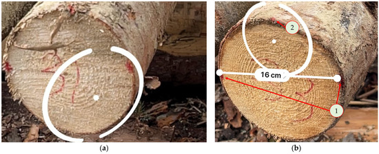 Examples of diameter measurements by the Measure app of iPhone in the second experiment (E2): (a) an example of log with marks placed; (b) an example of measurement over the log’s end diameter: 1—starting and ending points of measurement, 2—dot marked as the starting point of measurement for log length.