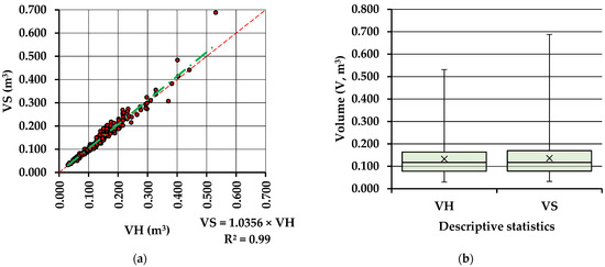 As shown in Figure 4a, there was a relative agreement between the two volume estimates based on the same measurements, at least for the data range from ca. 0.030 to ca. 0.130 m3. Beyond this threshold, the disagreement started to increase relative proportionally to the magnitude of volume.