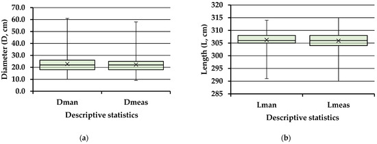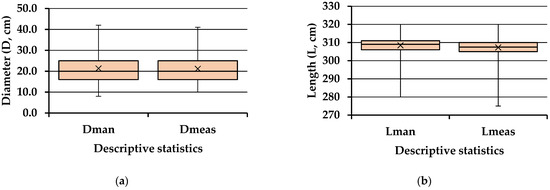 Figure 5 shows the main descriptive statistics of the diameter and length measurements done by the two methods. The mean values of Dman and Dmeas diameters were of 22.86 and 22.89 cm, respectively, and the median values were of 22 cm. In the same order, the minimum values were of 10 and 9 cm, respectively, while the maximum ones were of 61 and 58 cm, respectively. On average, the values of log lengths were close, with a mean value of 306.27 in the case of Lman and a mean value of 305.92 cm in the case of Lmeas. Minimum and maximum values were also close, with values of 291, 290, 314, and 315 cm for Lman and Lmeas, respectively. For both variables, data ranges were close as values among the methods.