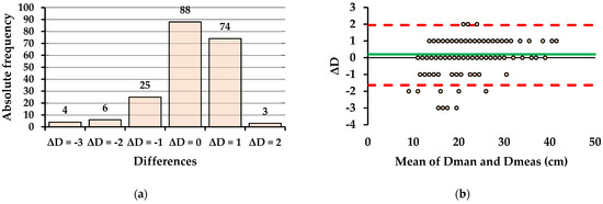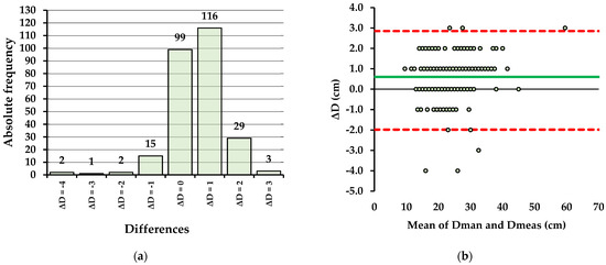 Agreement between the methods in terms of diameter measurement (E1): (a) Absolute frequency of differences (ΔD) between Dman and Dmeas; (b) Bland-Altman plot showing the differences plotted against the mean of paired measurements, the bias (green line), and the lower and upper limits of agreement (red dashed lines).