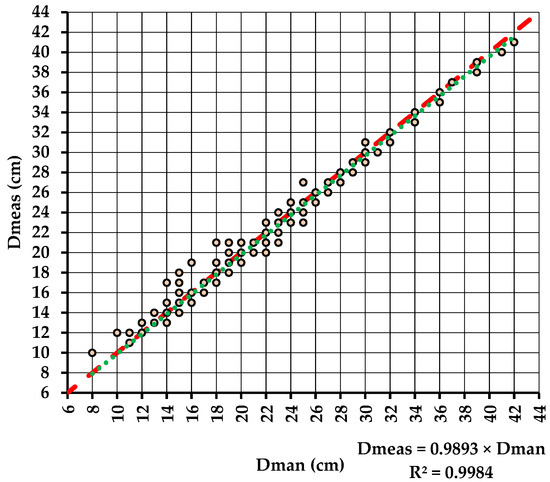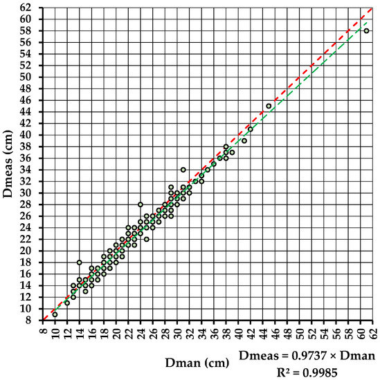 Relation between the diameters measured by the two methods (E2). Legend: red dashed line stands for perfect agreement and green dashed line stands for the dependence relation between Dmeas and Dman fitted by RTO.