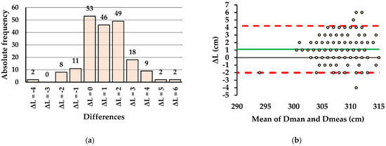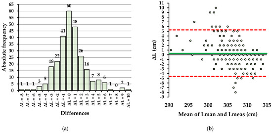 Agreement between the length measurement methods in E2: (a) Absolute frequency of differences (ΔL) between Lman and Lmeas; (b) Bland-Altman plot showing the differences plotted against the mean of paired measurements, the bias (green line), and the lower and upper limits of agreement (red dashed lines).