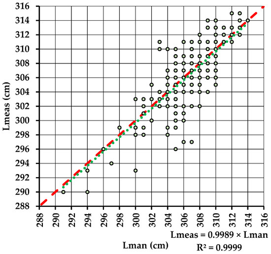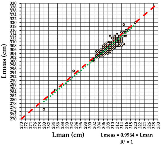 Relation between the lengths measured by the two methods (E2). Legend: red dashed line stands for perfect agreement and green dashed line stands for the dependence relation between Lmeas and Lman fitted by RTO.