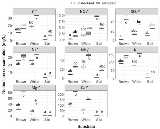 Nutrient ion concentrations in unsterilized and sterilized substrates (brown rot wood, white rot wood, and soil). Box plots display median, 95% confidence interval, and minimum and maximum values and points outside the box represent outliers. Different letters indicate significant difference among the six substrates (p < 0.05, Brunner–Munzel test with Holm adjustment of probability values). n = 5.