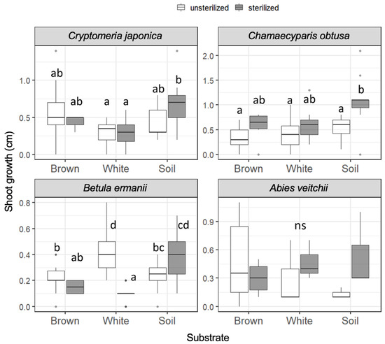 Seedling shoot growth of the four tree species during 121 days on unsterilized and sterilized substrates (brown rot wood, white rot wood, and soil). Box plots display median, 95% confidence interval, and the minimum and maximum values and points outside the box represent outliers. Different letters indicate significant differences among the six substrates (p < 0.05, Permuted Brunner–Munzel test with Holm adjustment of probability values). ns, not significant. n = 15 except for A. veitchii (n = 8).