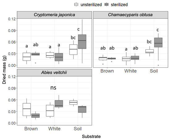Seedling dry mass of the three tree species after incubation on unsterilized and sterilized substrates (brown rot wood, white rot wood, and soil). Box plots display median, 95% confidence interval, and the minimum and maximum values and points outside the box represent outliers. Different letters indicate significant differences among the six substrates (p < 0.05, Permuted Brunner–Munzel test with Holm adjustment of probability values). ns, not significant. n = 15 except for A. veitchii (n = 8).