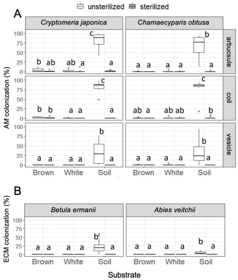 (A) Arbuscular mycorrhizal colonization in Cr. japonica and Ch. obtusa roots and (B) ectomycorrhizal colonization in B. ermanii and A. veitchii roots in unsterilized and sterilized substrates (brown rot wood, white rot wood, and soil). Different letters indicate significant difference among the six substrates (p < 0.05, Permuted Brunner–Munzel test with Holm adjustment of probability values). n = 15 except for A. veitchii (n = 8).