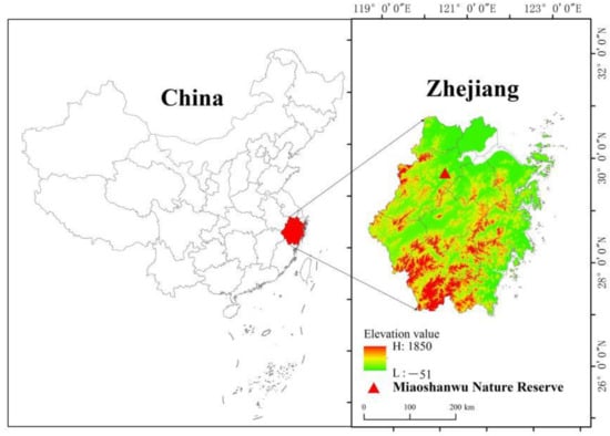 Location of the experimental area, Miaoshanwu Nature Reserve, Zhejiang province, China.