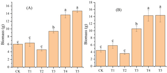 Compared to CK, the addition of biochar (T1 and T2) had no significant effect on the leaf and branch biomass of moso bamboo seedlings (p > 0.05), while adding N (T3, T4, and T5) significantly increased them (p < 0.05) (Figure 2). Compared to the addition of N (T3), the addition of biochar and N (T4 and T5) increased the leaf and branch biomass of moso bamboo seedlings in both groups (Figure 2)