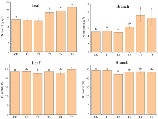 Effects of different treatments on total nitrogen (TN) and total carbon (TC) contents of moso bamboo (leaf and branch). CK: no biochar and no N addition; T1: 0.64% biochar + 0% NH4NO3; T2: 1.28% biochar + 0% NH4NO3; T3: 0% biochar + 1.28% NH4NO3; T4: 0.64% biochar + 1.28% NH4NO3; T5: 1.28% biochar + 1.28% NH4NO3. Bars (standard deviation) followed by different lowercase letters indicate significant difference at p < 0.05.