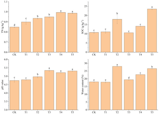 The addition of biochar increased the SOC content, with T5 presenting the highest value (23.53 g kg−1), followed by T2 (17.93 g kg−1) (Figure 4). Soil TN contents in T4 and T5, both of which were 0.99 g kg−1, were significantly higher than in other treatments (p < 0.05), and those in T2 (0.94 g kg−1) and T1 (0.90 g kg−1) were significantly higher than that in CK (0.85 g kg−1) (p < 0.05) (Figure 4). The soil pH value of T2 (4.97) was significantly higher than that of CK (4.75) (p < 0.05), while there was no significant difference between T1 (4.79) and CK (p > 0.05) (Figure 4). There was no significant difference in soil pH values of T3, T4, and T5 (p > 0.05), but they were all significantly higher than that of CK (p < 0.05). Soil water content in T2 (28.03%) was significantly higher than that in CK (18.07%) (p < 0.05), while there was no significant difference between T1 (17.90%) and CK (p > 0.05). The soil water contents of T3 (19.46%), T4 (22.75%), and T5 (26.59%) were significantly different (p < 0.05) (Figure 4).