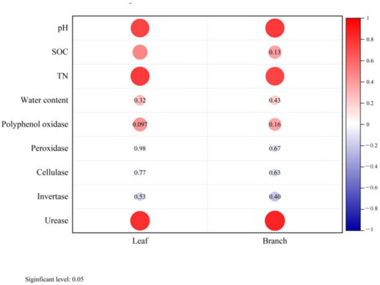 Relationship between soil properties and biomass of moso bamboo leaf and branch. SOC: soil organic carbon, TN: soil total nitrogen. Red color indicates significant difference at p < 0.05.