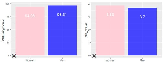 In Figure 1, we present the comparison of the mean overall Nature Relatedness score together with Psychological Well-being across men and women. There are slight gender differences in the results. Women, on average, have lower well-being score but higher Nature Relatedness. To investigate if these differences are statistically significant we employed Levene’s test for equality of variances (Levene’s: The p-value for WellBeingOverall was 0.344 while for NR_overall was 0.599) and one-factor ANOVA test for comparison of group means (ANOVA: The p-value for WellBeingOverall was 0.20 while for NR_overall was 0.001** and appeared significant) [47].