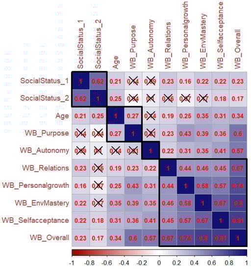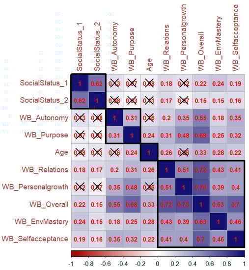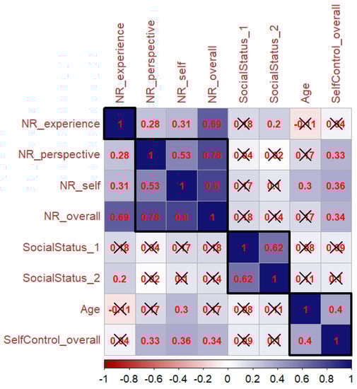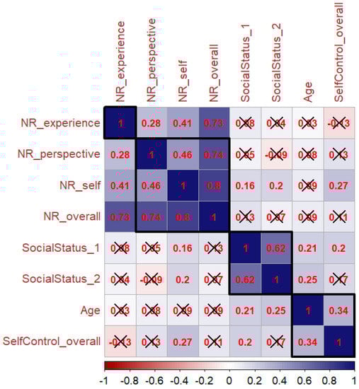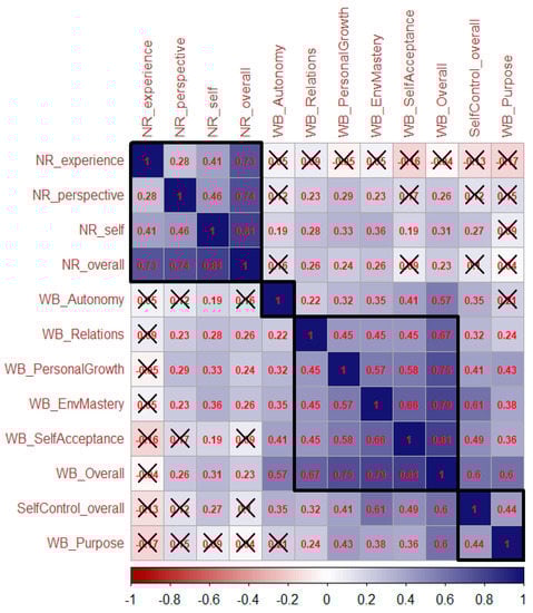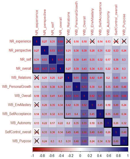 We also identified three correlation clusters (the continuous areas of matrix with strong and significant correlations). These could be mainly observed within the components of the same test, i.e., WB components are strongly and significantly correlated with each other, similar to NR components. The additional cluster was formed between overall Self Control and WB_Purpose.