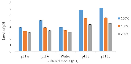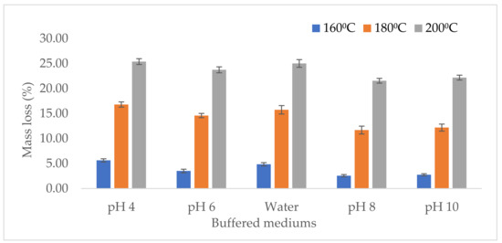 Temperatures of 200 °C in pH 4 (25.39%) and 160 °C in pH 8 (2.58%) resulted in the highest and lowest percentage of mass loss, respectively. According to Tjeerdsma et al. [26], acidic hydrolysis at various hydrothermal treatments can significantly increase the degradation rate of wood polymers. According to Theander and Nelson [19], the degradation rate of carbohydrates is high in acidic conditions, which is facilitated by the high availability and low crystallinity of hemicelluloses. In general, the exclusion of hydrogen (H+) and hydroxide (-OH) ions in hydrothermal treatment has no effect on the pH of the hydrothermally treated medium. Furthermore, in hydrothermal treatments using buffered media, the pH can be kept constant at a certain level and the destructive effects of the released acid can be controlled [29].
