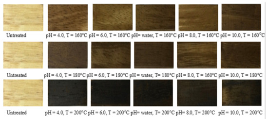 The most visible effect of treatment was a darkening of the color of the wood. Figure 3 depicts photographs of wood samples treated with hydrothermal treatment at various temperatures in different buffered media (acidic, water and alkaline). As can be seen in Figure 3, increased treatment temperatures increased the intensity of discoloration. Different media exhibited color differences at low temperatures, but there were no discernible changes in color at high temperatures. Lower temperatures (160 and 180 °C) caused less color changes in pH 6, 8 and 10 compared to acidic and water media, while high temperatures (200 °C) caused the most color changes. The hydrothermal treatment changed the color of the sample significantly as the treatment temperature increased [31,32,33]. This finding was consistent with the research findings in [34]. Color changes (wood darkening) are frequently attributed to the formation of oxidation and degradation elements from wood components [35,36]. The decrease in lightness caused by thermal treatment primarily indicates the formation of several components that absorb visible light [37]. According to Chen et al. [36], the condensation reactions of lignin and some extractives, as well as the formation of biproducts, contribute to an increase in the intensity of red tone in wood samples. Table 1 shows the chromatic value changes of treated and control rubberwood samples.