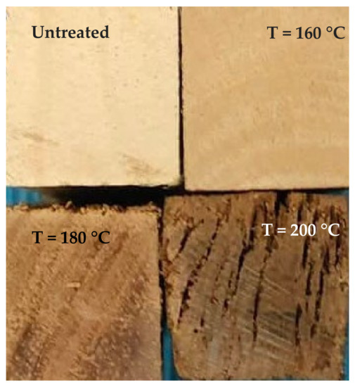 Visual appearance of untreated and treated rubberwood at different temperatures.