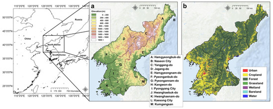 The Korean Peninsula is located in the mid-latitude region in Eastern Asia, and North Korea occupies the northern half of the peninsula (Figure 1). North Korea is specifically located at 37.41° N–43.01° N and 128.17° E–130.41° E and covers an area of approximately 122,000 km2, with mountainous areas in the northeast and plains in the western part. North Korea is a temperate monsoon, according to the Köppen climate classification, and has a cold, dry winter and hot summer. [14]. The average annual precipitation and annual mean temperature are 1000 mm and 10 °C, respectively [25]. Mountains and uplands cover approximately 80% of North Korea’s land. The Baekdudaegan mountainous region is located along the northern and eastern coast of the Korean Peninsula [26,27]. The Kaema Plateau, the highest region in the Korean Peninsula, is located in the northern part of the country, including Baekdu Mountain.